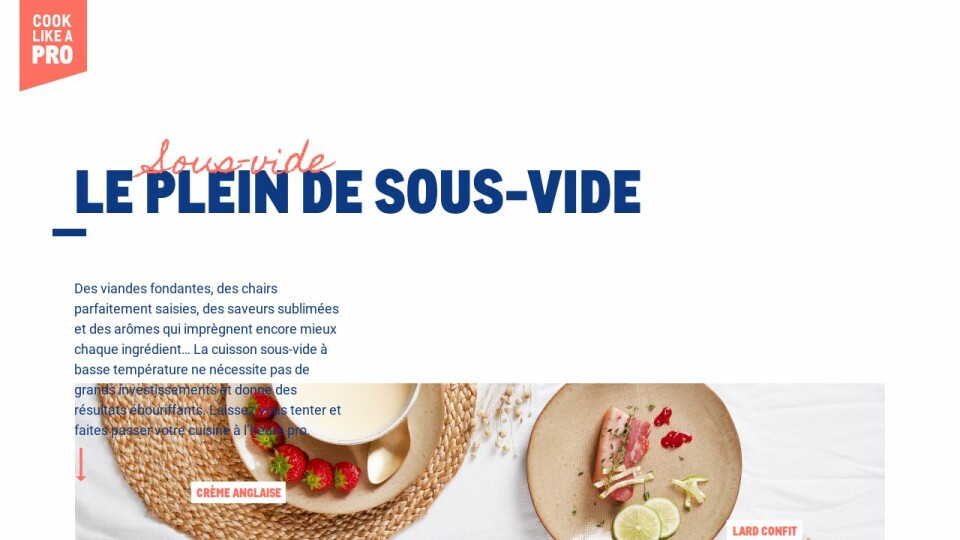 Des viandes fondantes, des chairs parfaitement saisies, des saveurs sublimées et des arômes qui imprègnent encore mieux chaque ingrédient… La cuisson sous-vide à basse température ne nécessite pas de grands investissements et donne des résultats ébouriffants. Laissez-vous tenter et faites passer votre cuisine à l’heure pro.