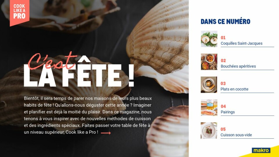 Bientôt, il sera temps de parer nos maisons de leurs plus beaux habits de fête ! Qu'allons-nous déguster cette année ? Imaginer et planifier est déjà la moitié du plaisir. Dans ce magazine, nous tenons à vous inspirer avec de nouvelles méthodes de cuisson et des ingrédients spéciaux. Faites passer votre table de fête à un niveau supérieur, Cook like a Pro !